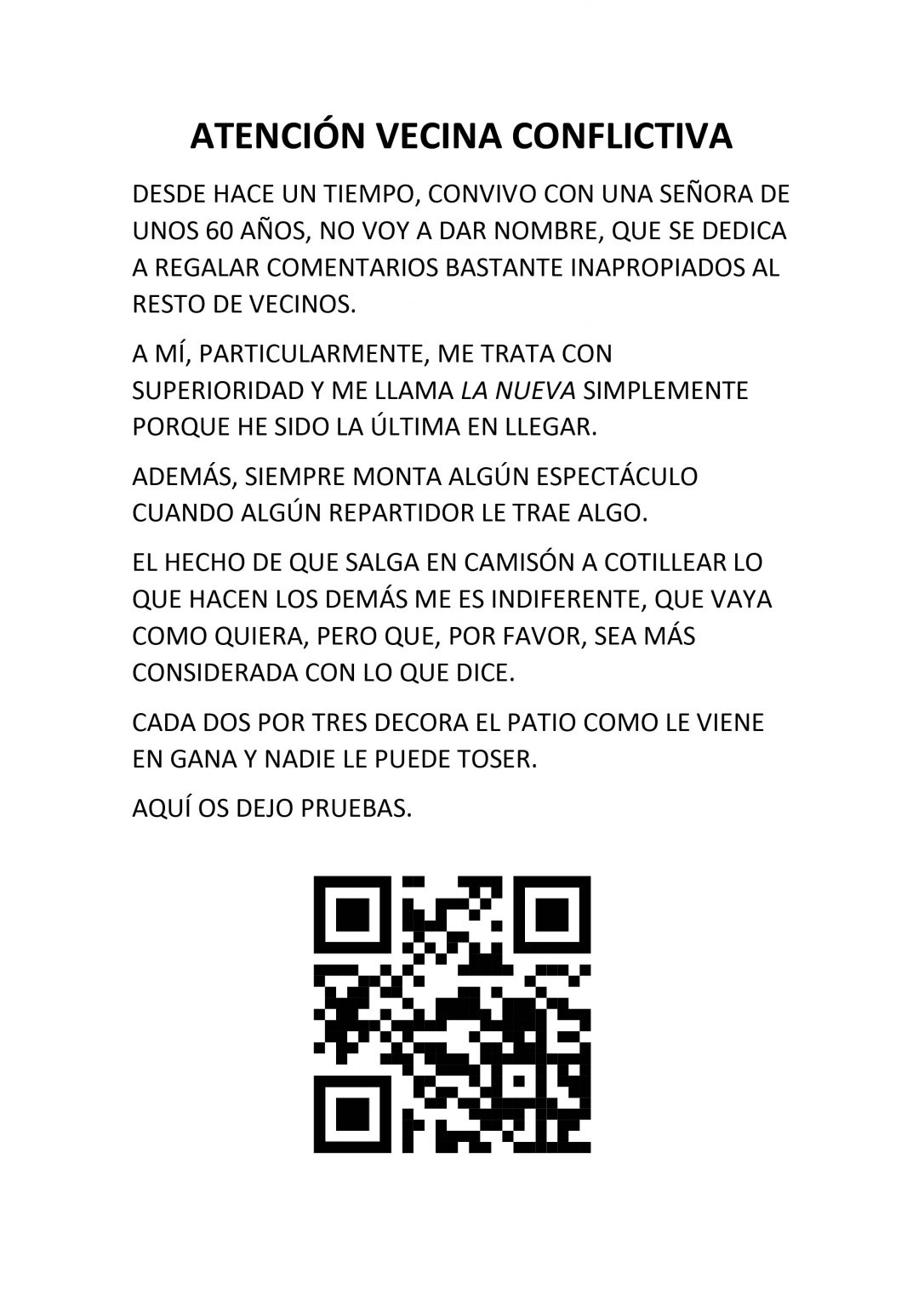 Además de la comunicación digital, en 2021 llevé a cabo una acción de street marketing bastante llamativa. Se trataba de un cartel donde podías leer que una joven estaba harta de su vecina y advertía sobre lo conflictiva que era. Lo pegué en diferentes calles y portales y estaba escrito de manera que pudiera pasar por el típico que encuentras en el ascensor de un bloque. Lo acompañaba con un QR que te llevaba a la página de compra y que me permitía ver las estadísticas de visita. Uno de los carteles lo ubiqué en el pilón de mi casa y la gente me regaló, sin saberlo, momentos muy divertidos.