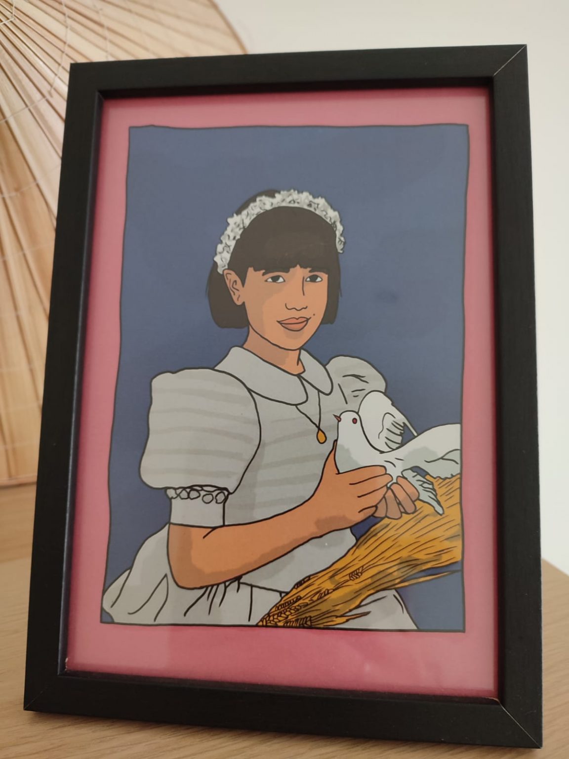 También, subí un destacado donde aprender gramática con La Asun mediante cuestionarios y tips y hasta organicé un concurso de fotos de comunión que atendía al capítulo 8, Comuniones y Traumas. ¿Qué podías ganar? Tu foto de comunión ilustrada por Noelia Urbano. La mecánica era sencilla, subías la instantánea de ese momento eclesiástico y etiquetabas la cuenta. Después hacía el sorteo entre los participantes. Este es el resultado de la foto ganadora, mucho mejor que la imagen original, ¿no?