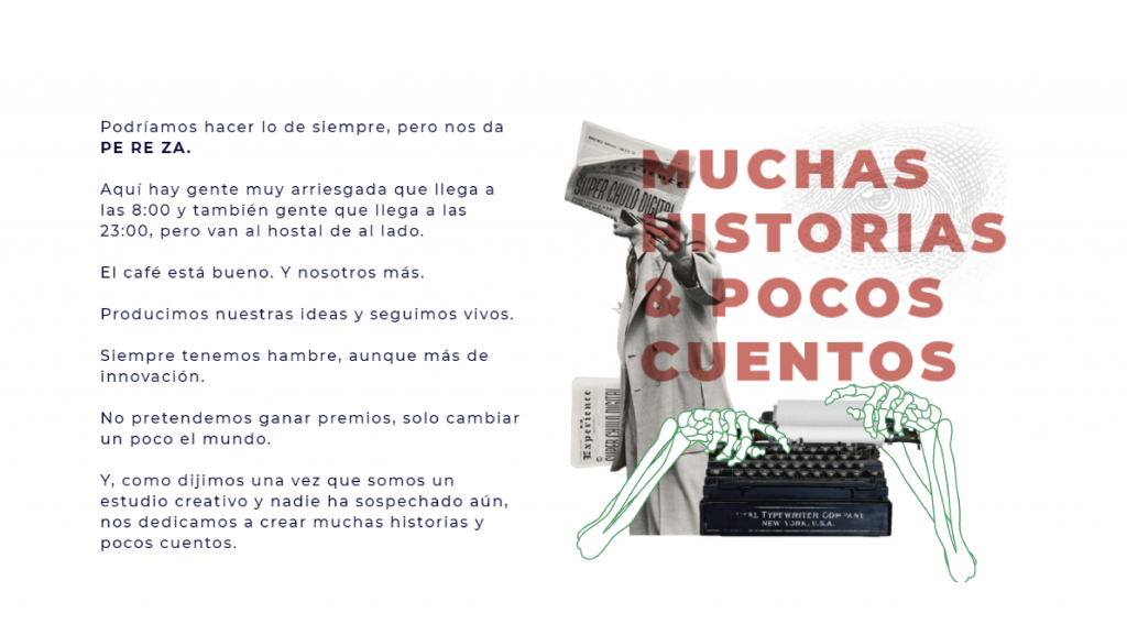 Este estudio es divertido, cercano, familiar, muy Juan Palomo, con buen humor, bastante digital y con las ganas de poder cambiar un poco el mundo a través de la comunicación. Son honestos con los clientes y no maquillan los presupuestos, por todo ello diremos que tienen:
