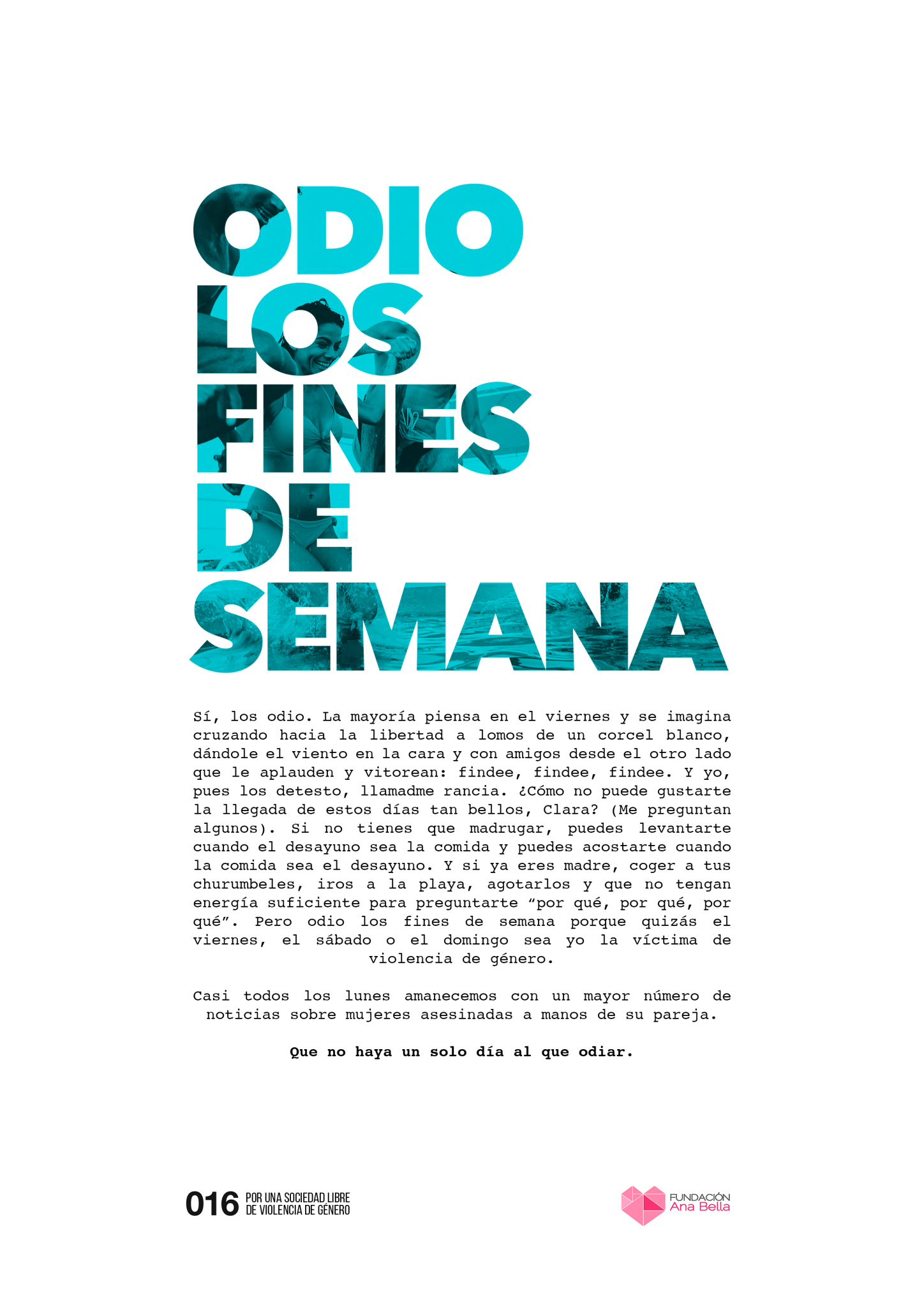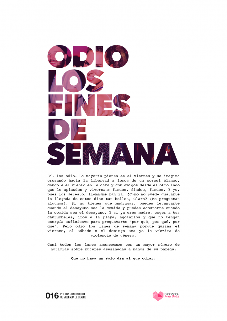 Casi todos los lunes, los telediarios anuncian una nueva víctima de violencia de género. Es durante los fines de semana cuando se producen la mayoría de asesinatos de mujeres a manos de sus parejas hombres.